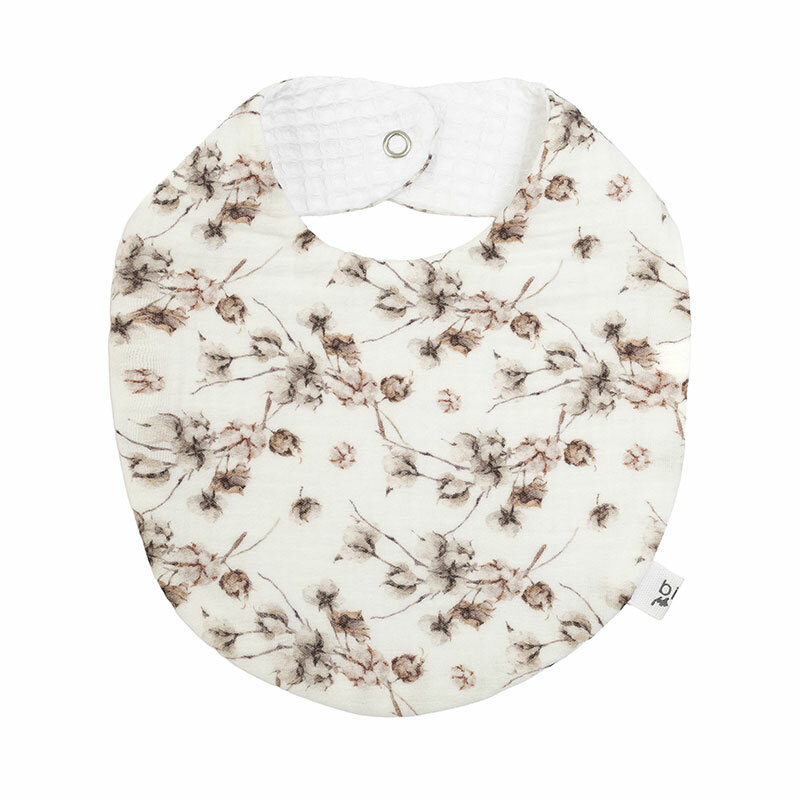 Bavaglino double-face in mussola di cotone fantasia batuffoli di cotone grigi su fondo chiaro e spugna di cotone a nido d’ape col. bianco.