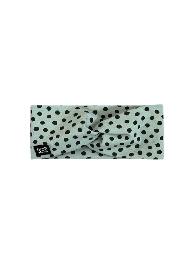 Fascia per capelli in jersey di cotone leggero colore verde con pois neri, con incrocio sul davanti.