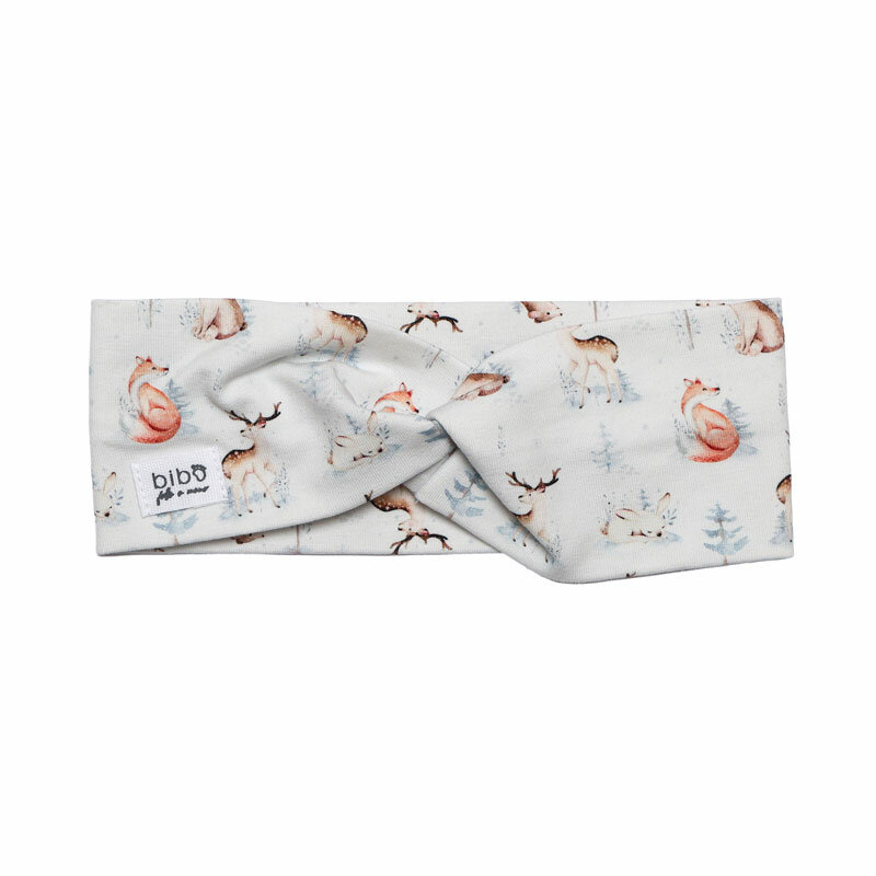 Fascia per capelli in jersey di cotone fantasia alci e neve su fondo grigio, con incrocio sul davanti.