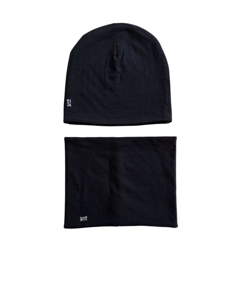 Cuffia in jersey di cotone color nero con interno in minkie pile nero e scaldacollo double-face in jersey di cotone fantasia e interno in pile.