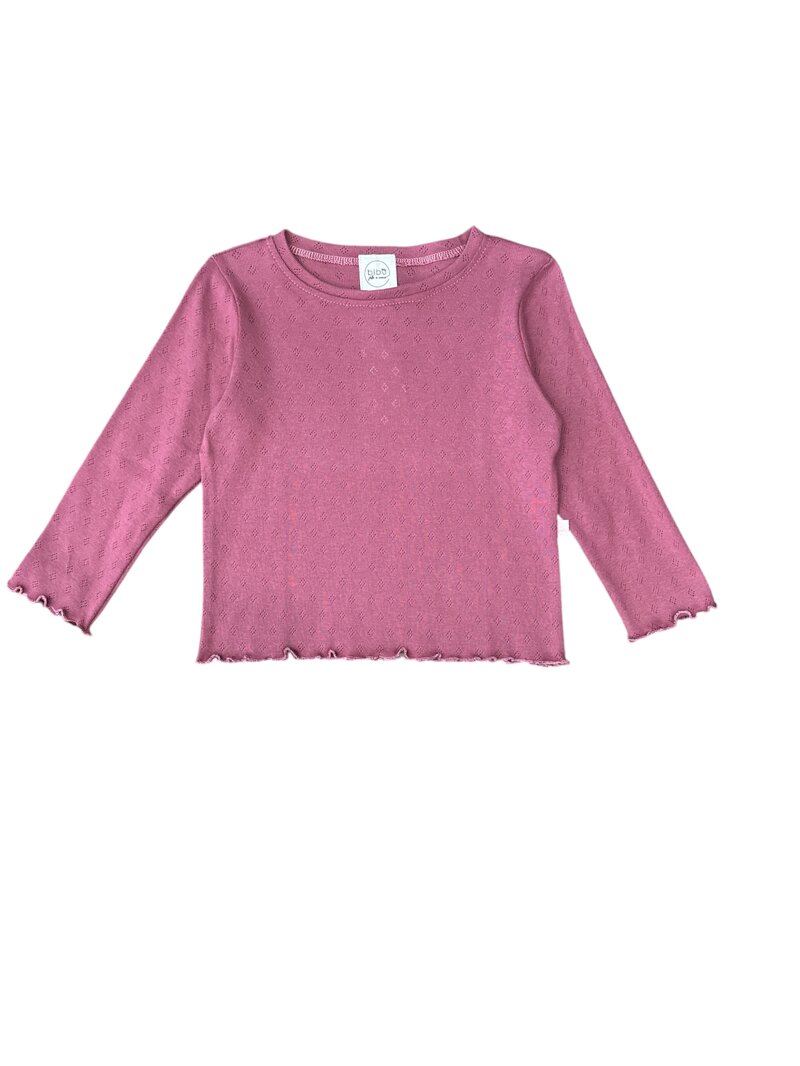 Colore malva è rifinito nei bordi manica e fondo maglia con punto decorativo.