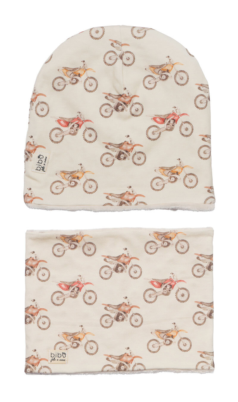 Cuffia in jersey di cotone fantasia moto su fondo beige con interno in minkie pile beige e scaldacollo double-face in jersey di cotone fantasia e interno in pile .