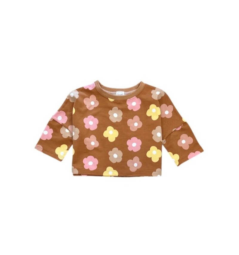 Felpa in fantasia fiori marroni, modello a scatoletta corta con manica lunga, in felpa di cotone.