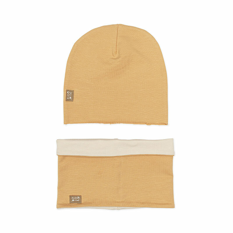 Cuffia e scalda collo double-face in felpa di cotone marrone cammello con interno in felpa di cotone beige .