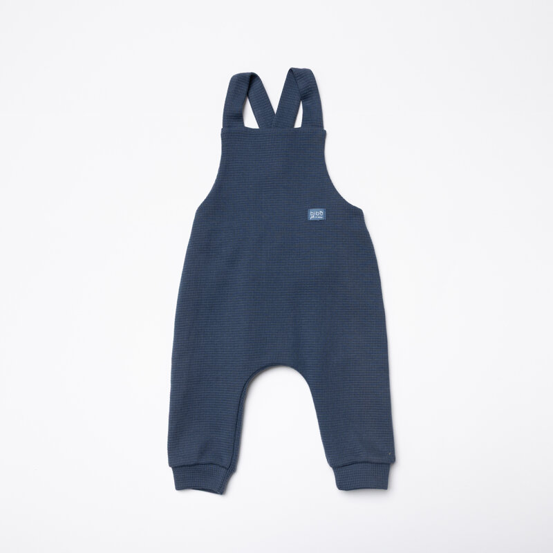 Salopette in felpa di cotone waffle. Abbottonatura sul dietro con doppio bottone a pressione per sfruttarla più a lungo.