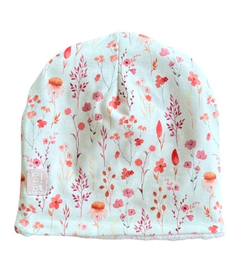 Cuffia in jersey di cotone fantasia fiori rosa con interno in minkie pile rosa pastello.