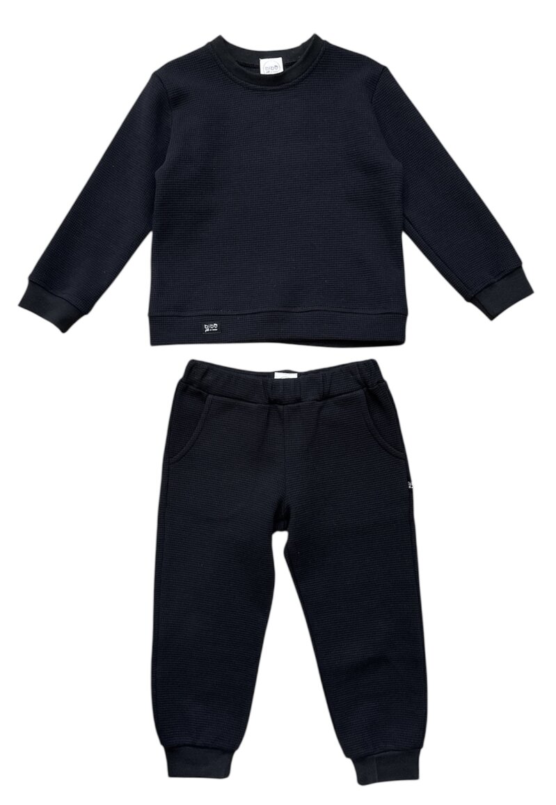 Tuta in felpa di cotone colore nero, la felpa è girocollo con polsini e bordo in maglia e il pantalone modello basico con polsini ed elastico in vita.