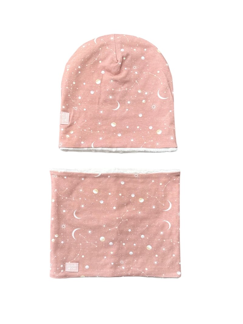 Cuffia in jersey di cotone fantasia pianeti e stelle su fondo rosa antico con interno in minkie pile beige e scaldacollo double-face in jersey di cotone fantasia e interno in pile .