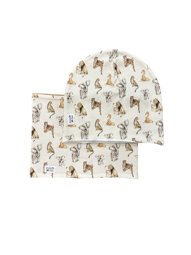 Set cuffia in jersey di cotone fantasia animali del safari e scaldacollo fantasia con interno in felpa color cammello.
